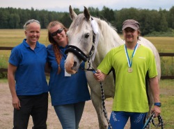 Koska olimme kupanneet, niin palkintojenjako tuli varsin nopeasti. Hevosella sentään oli ehditty pitää kylmiä jaloissa ja se oli muutenkin siistin näköinen. Äijä sen sijaan ei ehtinyt vaihtaa vaatteita, eikä hänellä mitään parempaa mukana edes ollut, koska ei odotettu mitalisijaa. Vähän oikin hävetti, kun vaatetus oli niin nuhruinen. Onneksi Ines ja Emma olivat siisteissä vaatteissa ja hevosten selässä. Kari meni taluttaen, sillä oman suorituksen loppumisesta oli niin lyhyt aika, että ei ehditty kaveria edes satuloida.