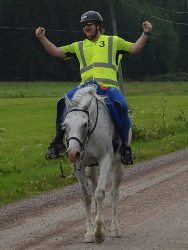 Kari ylitti maalilinjan käynnissä, mutta tuuletellen, tietenkin. Kannustusta tuli ja sitä saimme koko matkan ajan, kun siirryimme tauko/tarkastusalueelle. Aika mahtavaa. Hevonen oli väsynyt. Sykkeet pomppivat pitkään 58 ja 64 välillä. Aika kuumottavaa oli, että koko toimihenkilöporukka oli vieressä odottamassa, sillä heitä odotti viimeinen tarkastus. Myös paikalla olleet muut ihmiset olivat kerääntyneet seuraamaan tilannetta. Kari mittasi sykettä, Hanna piti hevosta ja mä loiskin vettä. Laskeskeltiin myöhemmin, että 400-500 litraa sitä päivän aikana kului. Arviolta nysväsimme vajaan vartin verran ennen lopputarkastusta. Arkailtiin mennä, mutta toisaalta tiiviisti seuraavat katseet houkuttelivat siirtymään jo tarkastukseen. Sykkeen mittaaminen tuntui kestävän n. puoli tuntia. Katselimme toisiamme ja pidimme muka kepeää keskustelua yllä. Lopputarkastus on kyllä ehkä kaikista pahin paikka. Lopulta ell ilmoitti sykkeen, joka oli 64. Aika korkea ja mielestämme emme menneet edes riskillä, mutta mikä lie mittaushetkellä nostatti sitä, kun tosiaan oli omassa mittauksessa annettu mennä reippaasti alle kuuden kympin. Ihon kimmoisuus oli B ja kaikki muut kohteet A. Eihän siinä sitten muuta, kuin kovat halit päälle ja kiitokset toimihenkilöille. Pauliina oli kapsahtanut Karin kaulaan jo maaliviivalla oli tietenkin ensimmäisten joukossa onnittelemassa. Ei mitään järkyttävän suuria tunteita, mutta tietenkin ilon ja onnistumisen fiilikset olivat päällä, kun aloimme laitella hevosta ja purkaa leiripaikkaa. Onnittelijoita riitti ja sadekin kilpistyi muutamaksi pisaraksi. Kari ylitti maalilinjat 2 minsaa yli kolmen, joten aika lailla hyvin oltiin aikataulussa.