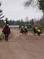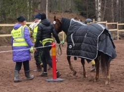 Päivän mittaan säät vaihtelivat. Välillä satoi, välillä tuuli, välillä tuli lunta ja loppua kohti saatiin jopa aurinkoa. Meidän tarkastuspisteessä oltiin hymyssä suin ja mua huvitti, miten porttipariskunta oli kehittänyt metodin, jossa seisoivat selät vastakkain toisen tuijottaessa kelloa ja toisen hevosen etujalkaa sen astuessa linja yli. Ajat otettiin sekunnilleen ja harjoiteltiin tulevia isompia kisoja varten. Reitteihin tutustuttuani olin jo todennut, että on niin mutkikasta ja teknistä rataa ja koviakin pohjia, että ontumia varmasti tulee ja niin ikävä kyllä tulikin. Tylsältä tuntui jokaisen hylätyn ratsukon puolesta. Homma kuitenkin hoitui asiallisesti. Päivän päätteeksi oli kiva kiittää tämänkertaista tiimiä. Homma toimi ystävällisesti mutta napakasti, aikataulut pitivät, ruuhkia ei syntynyt ja vaikka sade pehmitti tarkastuskortit, niin ylävitoset saatiin heittää viimeisen tarkastuksen jälkeen.