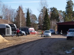 Niinhän siinä kävi, että syke ei laskenut ei sitten millään. Kävin jo varoittamassa Ninaa, että tämä on tilanne. Toiveissa oli, että tammat pysyisivät piilossa, mutta ei onnistunut ja Dali oli ihan täpinöissään. Mentiin ihan ajan loppuessa tarkastukseen. Syke hyppi ja pomppi. Ja eikö se vielä könkännyt juoksutuksessakin. Tosin tällä kertaa takaa. Ilmeisesti oli kroppa krampissa, kun oli niin pitänyt tammoille bullistella. Viilennettiin niin rajusti, että oripoikaa alkoi tuulessa paleltaa. Tarkastus tehtiin loppuun sisätiloissa ja vetit olivat vähän huolissaan. Syke pysyi aika pitkään epätavallisen korkealla, mutta hevonen söi ja joi tyytyväisenä. Eipähän siinä mitään. Se oli puolisen tuntia tarkkailussa. Kari oli taas niin höveli, että lupasi viedä Tarankin hevosen takaisin kotiin. Se tarkoitti kolmen tunnin odottelua. Ehdittiin käydä mökillä tankkaamassa ja pakkaamassa kamat. Mä lähdin vähitellen kohti kotia ja Kari Jarkon kanssa Kuumaan kuskaamaan hevosia. Pienenä yllätyksenä tuli, että tavaraakin oli aika paljon. Lisäksi siinä oli sellaista pienimuotoista karsinoiden tyhjennystä yms. Kesti melkoisen kauan ennen kuin pääsivät kotimatkalle.