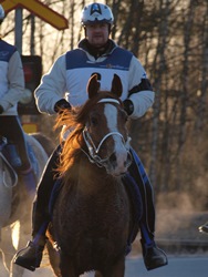 Herätys oli vähän ennen neljää ja totesin siinä sitten heti alkajaisiksi, että mulla on yön aikana iskenyt migreeni päälle. Arvottiin hetki tilannetta ja todettiin, että ota Maxaltin ja menen vielä hetkeksi vaateriin. Kari ja Jarko lähtivät liikkeelle kohti tallia ja laittelemaan hevosta valmiiksi. Levytin tunnin ja vähän huterana lähdin viideltä perään. Kun hetken oli ollut raittiissa ilmassa, niin olo olikin jo parempi. Valmisteltiin Jarkon kanssa taukopaikka ja laitettiin äijä matkaan. Sitten kiirehdittiin hakemaan unohtunutta kameraa ja suunnattiin ensimmäiseen huoltoon. Ennakkoon oli sovittu, että vauhti saisi olla 12-14 km/h haarukassa. Rauhallisesti lähtivät liikkeelle. Mielestäni kovilla alustoilla olisivat voineet lähteä vieläkin rauhallisemmin, mutta ihan hyvältä meno näytti. Kolmessa vartissa olivat kympin kohdalla. Kärki pyyhki viiden minuutin päässä. Kukaan ei viilentänyt hevosia, koska vielä oli vähän pakkasta, mutta muutoin huollot olivat valmiustilassa. Rata oli aika haastava monelle ratsukolle. Kotimaiset astelivat yli tietenkin tottuneesti, sillä tuttuja reittejähän nuo ovat. Oli päätetty, että jätetään ratsastusloimi pois, mutta vähän mietin, olisiko se kuitenkin ollut ihan paikallaan. Tanjan ja Karin vanavedessä kulki myös venäläinen Igor, jonka kanssa olin ennen kilpailua käynyt jo monta mielenkiintoista sähköposti- ja puhelinhetkeä.