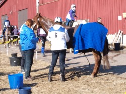 Aurinko alkoi lämmittää ja pohjat sulaa. Oli laitettu ratsastusloimi päälle, mutta ekassa huollossa Tiina ja Miva nappasivat sen pois. Ensinnäkin hevosella tuntui olevan kuuma ja koska kangas vähän läpytteli pepulle, niin hevonen oli ehkä turhankin virkku ja sykkeet olivat kohollaan. Kun loimi poistettiin, niin sykkeet laskivat normaaliin haarukkaan. Me mietittiin Jarkon kanssa omassa huoltopaikassamme, että toivottavasti kylmä viima ei jäykistä hevosta, mutta ilmeisesti tuuli puhalsi vain meidän huoltopisteessämme.