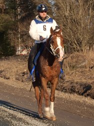 Yksinään sitten jatkoivat matkaa. 30km:n huollossa Taran huolestunut huoltaja kertoi meille, että Kari ehkä on joutunut keskeyttämään. Hämmästelin hetken, että mitähän nyt taas on tapahtunut, mutta sitten hoksasin, että puhuivatkin tästä kenkärikosta. Varttia myöhemmin Kari tuli huoltoon. Taas oli operoitavaa, sillä ennen asfalttiosuutta päätettiin ottaa toisestakin etukengästä hokit pois. Aikaa kului taas hetki. Vähän meno oli yksinään tahmeaa ja taas edessä oli puuduttava asfalttiosuus. En ollut ihan varma siitä, oliko liike puhdas, mutta lähdettiin kartanolle ottamaan ratsukkoa vastaan.