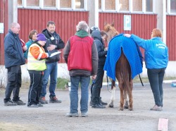 Tiina ja Miva ottivat vielä yhden huollon pari kilsaa ennen taukoa ja me mentiin Jarkon kanssa laittamaan paikat kuntoon. Ratsukot saapuivat tauolle aika tarkkaan kahden tunnin ratsastuksen jälkeen. Vauhti oli ollut inan verran yli 13 km/h. Palautuminen oli aika lailla samaa kuin aikaisemminkin, 2-3 min. Nyt hevonen oli syönyt ja juonnut, joten tarkastukseen menimme suhteellisen rauhallisina. Vähän nuutuneelta hevonen vaikutti ja eläinlääkäri totesikin, että on syytä ottaa rauhallisesti ja tarkkailla hevosen jaksamista. Liikkeestä edelleen A.