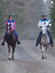 Tiina ja Miva olivat jo ilmoittautuneet palvelukseen. Tiedotin heitä, että nyt ei ihan äärettömän hyvältä näytä. He odottelivat kilpailukeskuksessa ja hurrasivat Tanjan matkaan Valedrolla. Tanja oli ollut vähän jännittynyt, mutta Valto oli käyttäytynyt tyylikkäästi, joten ilman mitään kommelluksia pääsivät matkaan. Kommelluksia seurasi kuitenkin heti, kun vähän harhautuivat reitiltä ja FEI-luokan ratsukoiden mallia seuraillen etenivät pellon reunaa, jossa reitti ei oikeasti kulkenut. Tämän jälkeen innokkaimmat kurvasivat ihan omille poluilleen ja kaaos oli kyseisen luokan osalta valmis. Puhelinlinjat taisivat olla kuumana moneen suuntaan ja loppujen lopuksi taisi olla aika epäselvää millaisen lenkin ja millaisen matkan kukin oli kulkenut. Onnellinen loppu kuitenkin, että määräämättömien puheluiden ja neuvotteluiden jälkeen jokainen kyseisen luokan osallistuja sai hyväksytyn tuloksen.
