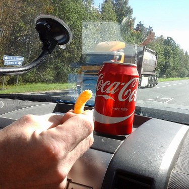 Kun päästiin Latvian puolelle, niin piipahdettiin tankille ja samalla kipaisin hakemaan hamppiksia. Ja nyt olikin vastassa kielimuuri. Sain kuin sainkin pari käärylettä mukaan. Pistettiin murua rinnan alle ja taas jaksoi ajella. Töppärät olivat nyt meidän perässä ja Turusen Durango oli siirtynyt etuautoksi ja etsivät meille sopivaa paikkaa purkaa hevoset hetkeksi jaloittelemaan. Sellainen löytyikin aika nopeasti ja Hanu oli jätetty valtatien viereen viittoilemaan käsimerkkejä. Ajettiin yhdistelmä parkkiin ja purettiin hevoset pihalle. Pysähdyspaikka oli aika lailla ajomatkan puolivälissä.