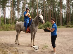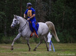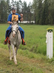 myös oman jugurttipommin ja toivin, että Miva ja Tiina olivat päivän aikana ehtineet myös jotain pistää suuhunsa. Itse yritin juoda mahdollisimman paljon, sillä päänsärky vähän väijyi jo taka-alalla. Olin lähettämässä luokan 4 ratsukoita, joiden tauko oli Karin taukoa 10 minuuttia lyhyempi. Taisivat kaikki vähän myöhästyä lähdöstä ja Karikin myöhästyi kymmenisen sekkaa omastaan. Siitä pääsin antamaan jopa pienen kuitin, koska yleensä ollaan varsin tarkkoja siitä, että myöhässä ei lähdetä. Mutta siitä vaan lähti Urho reippaasti matkaan. Edessä näkyikin nyt alemman luokan ratsukoiden selkiä ja niitä oli hyvä napsia yksi kerrallaan. Vauhtia ei voinut enää kuitenkaan pitää yllä, sillä tarkasti oli tiedossa, että maaliin ei saa tulla aiemmin kuin 13:30. Nyt pitivät pari varsin hidasta taukoa, jotta aika kuluisi. Tiina meni taas loppuviitoitukselle vastaan ja viilensivät siellä vielä. Kaikessa rauhassa Kari sitten käppäili maaliin. Vähän taas kalkulointi petti sillä ylittivät maaliviivan ajassa 13:32.