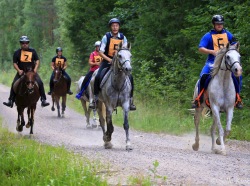 Kun palailin tarkastusalueelle, niin näin, että Kari, Miva ja Tiina jo painelivat peräkkäin pitkin aluetta. Vaihdettiin muutama sananen ja muistutun huoltajia, että ensisijainen homma tulee varmasti olemaan toppuuttelu. Ja lisäksi olimme jo ennakkoon arvelleet, että kiirettä tulee pitämään. Paneuduin omiin tehtäviini, mutta silmäkulmasta pidin tietenkin silmällä, että Karin hommat lähtivät rullaamaan. Järjestelivät kamat autosta toiseen. Ainut sählinki oli se, että verkkojen aikana Kari totesi, että rannetietokoneen patterit olivat lopussa. Vähän tuli kiire niitä vaihtamaan, mutta muuten kaikki oli hyvin. Kun lähtölupa annettiin, niin ratsukko lähti heti omille teilleen, niin kuin oli aiottukin. Haluttiin hakea suoritus nopeudella 15km/h ja koska aamu oli vielä mukavan viileä, niin ensimmäinen lenkki oli tarkoitus mennä nopeasti, mutta kuitenkin siten, että tarkastukseen päästään suoraan.
