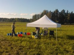Omaan silmääni kilpailukeskus näytti oikein toimivalta ja ennen kaikkea tilavalta. Inhoan ahtaita sumppuja, joten tämä avara alue oli oikein mieleen. Juoksutin hevosta pätkän ja Kari katsoi, sitten vaihdettiin rooleja ja vietiin hevonen tarkastukseen. Ell kehui hevosta kokeneeksi, koska se käyttäytyi hienosti, juoksi hienosti ja sykettä oli vaikea edes löytää. Se oli 44 ja meidän mielestä vähän yläkanttiin. Starttilupa oli lunastettu joten Kari kantoi viimeiset tavarat ja me Urhon kanssa tutustuimme paikkoihin ja nappailtiin märkää ruohoa. Nostettiin teltta täyteen harjaansa ja tässä vaiheessa Pauliina ja Matias saapuivat paikalle. Aika kunnioitettavaa kiinnostusta asiaan, kun ajelivat päivän aikana 500km vain huoltamaan ja auttamaan meitä. Take away -kahvimukit oli kummallakin kädessä ja heti alkoivat työn touhuun. Kantoivat vähän varusteita autoonsa ja Pauliina talutteli hevosta. Porukalle mentiin reittiselostukseen, joka olikin napakka ja selväpiirteinen. Kartat ihan oikeat suunnistuskartat, joten ainut ongelma reitin seuraamissa oli ikänäkö.