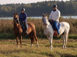 Kuudelta ylös, seitsemältä aamupalalle, tytöt kyytiin ja tallille. Vähän taluttelua ja siivosin karsinat. Vettä oli juotu hyvin ja kaikki oli syöty, mitä oli illaksi jätetty. Tallilla oli jo kova kuhina. Saivat taas syödä tuoretta ja yhdeksän jälkeen alettiin laittaa hevosta ratsastuskuntoon. Mari nousi Solon selkään ja yhdessä tekivät vähän reippaamman aamulenkin. Pari kuvaa otettiin heti pohjille, sillä joskus näissä kinkereissä käy niin, että muita kuvia ei syystä tai toisesta edes tule.