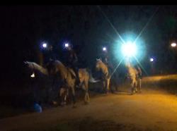 Kuudelta katsottiin pääluokan startti. Varsin pimeää oli ja tunnelma jännittävä. Otsalamppujen turvin ratsukot lähtivät liikkeelle ja osalla ei ollut edes otsalamppuja. Toki tunnin päästä maastossa selviäisi jo ilman lisävaloa, mutta kyllä tunti on aika pitkä matka mennä pimeässä. Toki aloittivat varsin rauhallisesti ja porukassa. Kun lähtö oli katsottu, niin Kari lähti laittamaan hevosta valmiiksi ja minä menin viemään viimeisiä tavaroita leiriin ja autoon. Ajoin auton jo kirkon eteen parkkiin, jotta pääsisin heti lähdön jälkeen liikkeelle.
