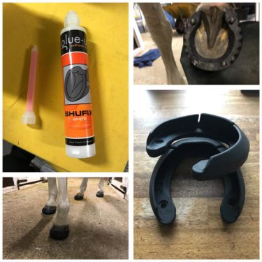 Sellan GluShut saapuivat. Kari niitä illalla mallaili ja tultiin siihen tulokseen, että pienellä fiilailulla istuivat hyvin ja pysyivät tallin käytävällä tepastellessa kiinni jopa ilman liimaa. Sama juttu näissäkin, että istuvuus pitää olla just eikä melkein. Ajatus oli, että annetaan tamman olla yö sisällä ja kiinnitys olisi heti seuraavana aamuna, niin kavio olisi kuiva ja liima pitäisi paremmin. Mielenkiintoinen havainto oli, että näennäisesti kuivan kavion ollessa kengässä hetken ja kun kengän otti pois, niin se oli sisäpinnaltaan kostea. Kari käi aprikoimaan, että pitäisikö kavio föönata kuivaksi ennen kuin kengän liimaa paikoilleen.