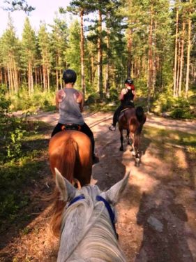 Kotimatkalla käytiin tosiaan hiekkakuopilla pulaamassa vähän vedessä ja Pedro sekä minä saimme sopivasti viilennystä. Jos ei matkan varrella olisi kaksvitosen ylitystä, niin kiva olisi montuilla käyttää hevosiakin kahlailemassa. Ridasjärvi itsessään ei käsittääkseni tarjoa mahdollisuutta moiseen luksukseen. Kun katselin siinä Pedron polskimista niin mietin, että kyllä uimisen täytyy olla hevosillekin upea tapa kohottaa kuntoa ja samalla hoitaa lihaksistoa.