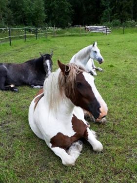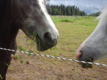 Hevoset oleilevat tyytyväisinä laitumella. Illalla ajeltiin niitä moikkaamaan. Siellä olivat. Kaikeksi onneksi hengissä ja aitojen oikealla puolella. Aika pullukoina. Kovasti olivat rapsuttelua vailla. Sellan kärsä rasvattiin, ei ollut vielä kärähtänyt, vaikka vähän on ollut aurinkoakin. Oletan, että Erika on rasvaillut. Ötökkämyrkkyä laiteltiin myös ja Tatankalle se oli jotenkin tällä kertaa vaikeaa.