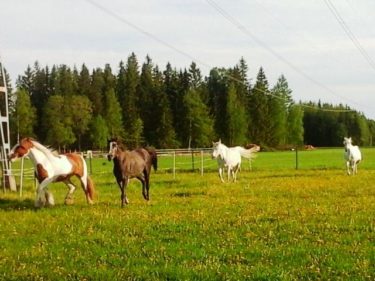 pääsivät laitumelle. Lauran piti tulla avuksi, mutta hänelle tulikin muuta menoa ja mo olin ulkona kuviosta. Caro ja Kari tekivät sitten kaksi lenkiä. Ensin herkkupöytien ääreen pääsivät nuoriso-osasto, jotka löyvät turvat maahan ja alkoivat syödä. Hetkeä myöhemmin valvoiset vauhtikoneet tulivat paikalle. Muutama juoksuaskel siinä otettiin, mutta varsin rauhallista oli. Ilmeisesti Sella on jo seestynyt keski-ikäinen, koska sitä ei enää kiinnosta pistää laulaa sekaisin siinä kohtaa, kun vapaus koittaa.