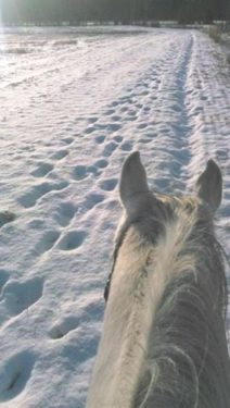 Kun lähtötilanne oli rauhoitettu, niin mentiin Ridasjärventien kautta takapellolle. Mua vähän hermostutti mennä vilkasliikenteisen tien vierellä. En edelleenkään pidä kuolaimetonta viritystä mieluisana. Enkä muutenkaan pidä ihan ideaalina, että puuhailen noiden tyyppien kanssa yksinäni. Jos mulle tänäänkin olisi jotain sattunut, niin ennen huomista ei kukaan mua kaipaisi. Rauhallisesti kuitenkin etenimme, mitä nyt auran jättämää lumikasaa ja paria kiveä piti pelästyä. Ei mitään mieletöntä draamaa, mutta varmuuden vuoksi olen nyt sentään pitänyt puhelinta taskussa kun olen ratsailla ja on se tallilla ainakin mukana. Päästiin pikkutielle ja oloni muuttui heti paremmaksi. Urho sätkähteli vielä muutamaa juttua, mutta sitten päästiin pellolle. Eka kiekka mentiin käyntiä ja ravia ja toka kiekka ravia ja laukkaa. Sitten pellon päähän ilmestyi traktori, jota piti alkaa kyyläilemaan. Tehtiin vielä jonkin aikaa voltteja ja kiemuroita. Lähdettiin palailemaan samaa reittiä ja potkin matkan varrelle tipahdelleet paskakikkareet pois. Urho oli hyväntuulinen ja palkitsin sen hevosherkuilla. Kun päästiin takaisin tallille, niin kuorin varusteet pois jo puomilla ja palautin sen tarhaan. Sella siellöä jo kovasti kaipailikin. Aurinko paistoi ja linnut lauloivat. Keväältä tuntuu.