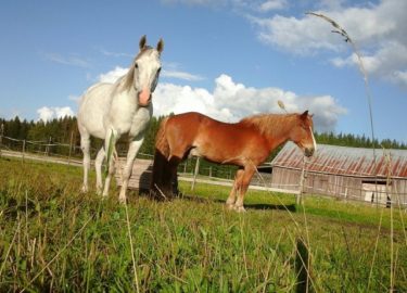 Sellan lenkkipäivä. Kari laitteli tamman valmiiksi ja minä pidin seuraa pojille. Olivatkin seurallisella tuulella. Aurinko paistoi illallakin lämpimästi, vaikka ukkoskuuroja oli päivällä kulkenut yli. Pienoinen tuuli kävi, joten ötököitäkään ei ollut hevosia kiusaamassa.