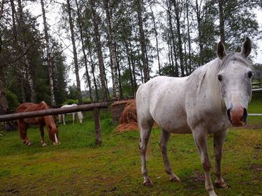 Sateinen päivä, mutta sateesta huolimatta kohtalaisen lämmintä. Vettä tuli ainakin Espoossa kuin saavista olisi kaadettu. Toisaalta hyvä, sillä maa ja kasvit ovat kärsineet kuivuudesta. Sade ei hevosia tunnu haittaavaan. Ahtavat ruohoa satoi tai paistoi.
