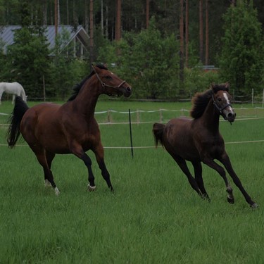 Ensi tuotiin pari lussumpaa tapausta. Ne lähinnä halusivat juosta ja saivaitkin teinitytöt heti kirmailuun mukaan. Olin aika helpottunut kun huomasin, että Tatankalla ei ollut mitään vaikeuksia karistaa isompia kavereita kintereiltään. Eikä siinä mitään ärhentelyä edes ollut ilmoilla. Kunhan juoksentelivat. Seuraavaksi tuli Pene ja tilanne heti vähän sähköistyi. Viimeisenä toinen haastaja ja jonkun verran Penen kanssa kolistelivatkin. Aikansa 8 hevost juoksentelivat ympäri laidunta. Varsat kieppuivat mukana. Fifi ohjaili varsoja(an) aina suojaan ja ne, jotka halusivat välejään selvitellä, selvittelivät.
