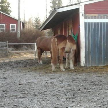 Tällä kertaa Urho ja Sella huutelivat toisilleen kiihkeästi. Laitoin väkkärit kuppeihin ja otin hevoset sisälle. Kari viritti yhden uuden renkaan heinäsäkeille tallin seinään. Saadaan useampi pussi tarha-alueen ytimeen. Muutenkin nyt yritetään pistää pusseihin vähemmän kamaa, mutta ripotella niitä ympäriinsä. En tajua, miten Urho on niin lihava! Sella alkoi heti hoikistua, kun tuli kotiin. Isot pojat ovat myös solakoita, Hopo jopa laiha, mutta se johtuu sen sairaudesta ja iästä. Mutta tämä yksi on ihan tankki. Kylkiluiden päällä on tuhdisti kamaa. Ehkä se Virossa sulaa pois. Tuskin sitä ennen.