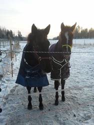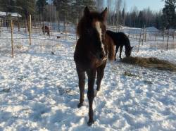 Hölkättiin takalenkki ja kierrettiin pellot. Sovittiin, että me lähdetään Hopon kanssa kotiin päin ja Urho huitaisee vielä toiseen kertaan peltojen ympäri. Lunta oli aika paljon peltoteillä kinoksina ja niistä sai kyllä sopivasta haastetta hevosten etenemiseen. Hopon kanssa kiirehdittiin taas karkuun, mutta samalla seurailin Urhon etenemistä. Se kykenee kohtalaisella frekvenssillä melko vauhdikkaaseen etenemiseen. Kovin pitkään ei ratsukolla lisälenkissä turpa tuhissut. Laukattiin vielä laukkasuora takaisin ja sitten aloiteltiin jäähdyttely. Hevoset olivat tyytyväisiä ja rennon letkeitä. Aurinko paistoi ja pakkanen oli siedettävissä rajoissa. Ennen tallia pitivät pojat vielä pissatauon ja sitten olikin hyvä palata tallille ja hörpätä vähän melassivettä. Lämmin tuli hevosille, joten annettiin nille tupot heinää ja pidettiin hetki kuivatusloimet päällä tallissa. Juotiin siinä itse kahvin ja glögit. Vaihdettiin hevosille kuivaa päälle ja pistettiin pihalle. Sinne jäivät aurinkoon.