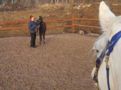 Puuhakas päivä. Aloitin aamun tallihommilla. Puolen päivän tietämillä oltiin jo Tiipiillä. Kari kiipesi selkään ja mä pidin seuraa Tatankalle, joka ei ollut ihan varma haluaako se juoksennella mamman mukana, vai karata kentältä omille teilleen. Porkkana, niin kuin kaikki muukin syötävä, kelpaa aina. Päätinkin ottaa sen kentällä talutukseen ja aloittaa pysähdys- ja liikkeellelähtöharjoituksia. Meni ihan hämmentävän hyvin. Varsaa ei suuremmin emän hommat kiinnostaneet ja sama päti Sellaan. Toki se vähän tarkkaili kuitenkin tilannetta, mutta ei puhunut mitään. Tatanka yskähti pari kertaa ja lipoi kielellä nenäräkää suuhunsa, niin kuin nuhaiset kersat.