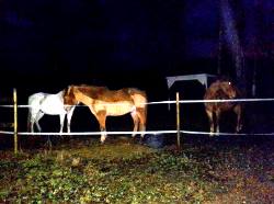 Tammat pääsivät sisälle ja me lähdimme mun viimeisille jouluostoksille. Kari palaili myöhemmin siivoamaan tarhaa ja kuudelta olimme taas isojen poikien luona ottamassa niitä sisälle. Hopo hönötti tammatarhan portilla. Kun Urho ja Hemppa kiirehtivät talliin sisälle, niin se vaan seisoi patsaana sateessa ja tuulessa. Kipaisin sen luo, otin harjasta kiinni ja lähetin tallin pääovelta omaan karsinaan.