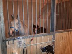 Aamulla Merkku ilmoitti, että hänen mielestään sekä Pamelan että Tatankan hengitys oli rahissut. Aika nopeasti tehtiin kollektiivinen päätös lähteä vierailulle Viikkiin. Mä pakkasin töihin mukaan tallikassin ja ajelin töistä suoraan tallille. Mervi taas alkoi hoitaa isoa autoa tammoille. Mitään lastausharjoituksiahan ei tässä ole tehty, joten luomuna mennään tässäkin tapauksessa. Mä olin jo tallilla häärimässä, kun kuljetus tuli ajallaan ja lastaushommat alkoivat. Sella meni ihan hyvin sisälle, mutta varsa heittäytyi veteläksi. Pyrki jopa kellahtamaan kyljelleen, kun olisi pitänyt kävellä sisälle. Karin juttujen mukaan se käytännössä kannettiin sisälle. Eipä silti, ei ollut helppoa Pamelallekaan. Kun kyytiin pääsivät, niin matkustivat ihan rauhassa nuokkuen ja syöden. Purku määränpäässä onnistui hyvin.